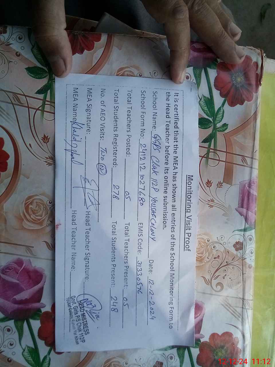 | EMIS Code: 31330576 | Name of School: GGPS CHAK 112/P YOUSAF COLONY | |||