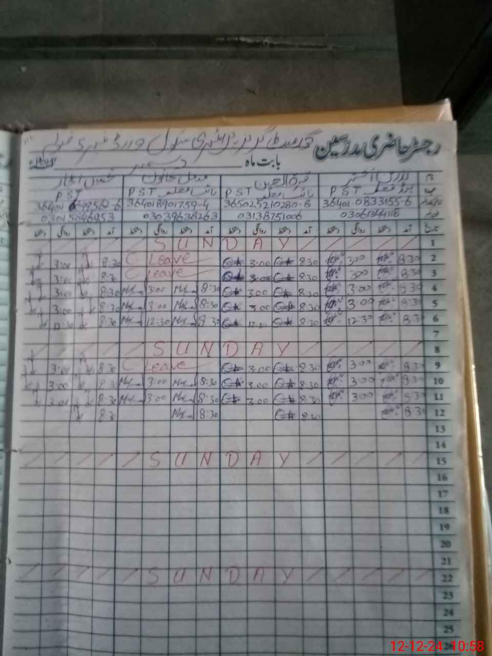 | CNIC | Full Name | Designation | R/C | Absence During Last Calender Month |