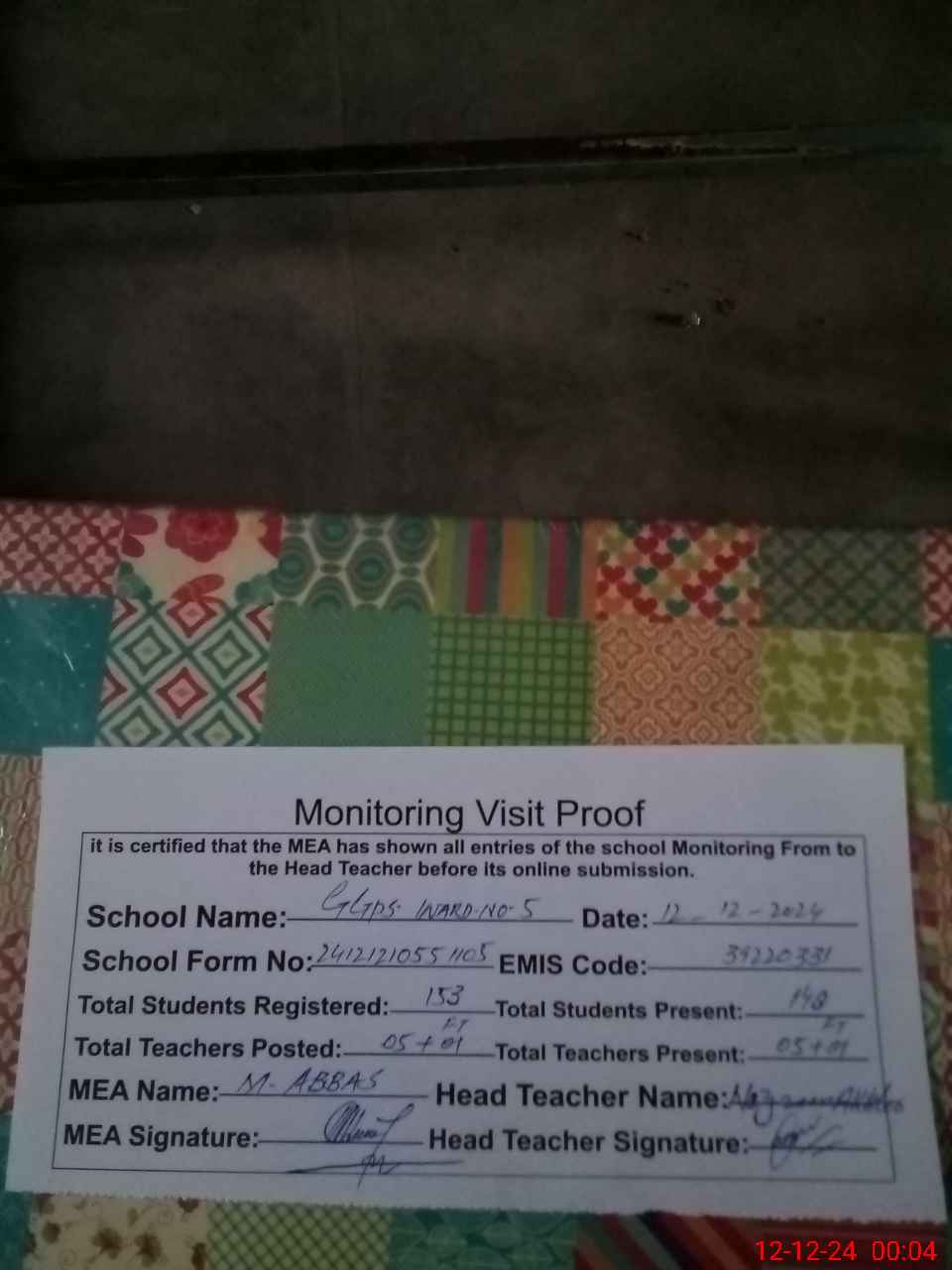 | Attendance Register | Head Teacher | MEA with School | Visit Proof |