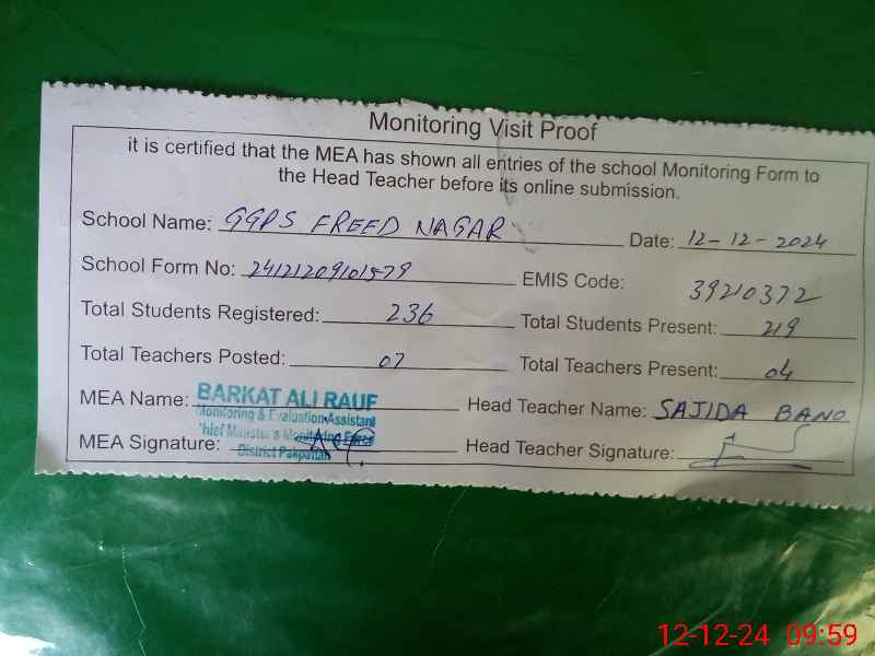| EMIS Code: 39210372 | Name of School: GGPS MOHALLAH FAREED NAGAR | |||