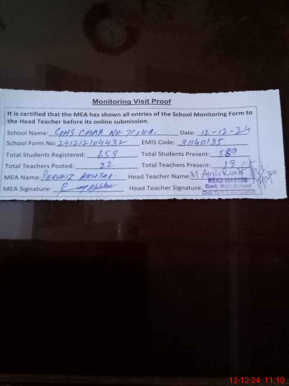 | Attendance Register | Head Teacher | MEA with School | Visit Proof |