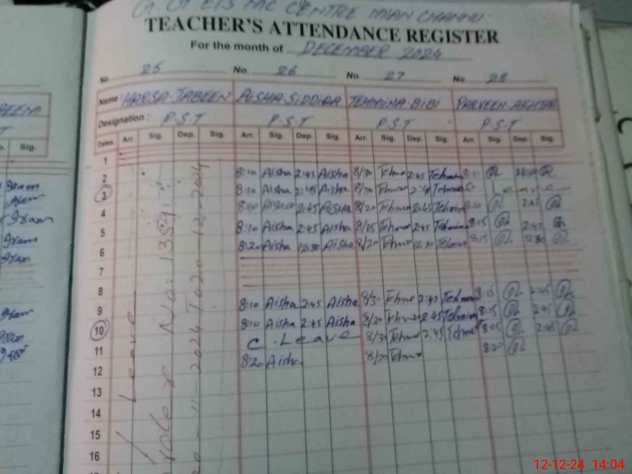 | CNIC | Full Name | Designation | R/C | Absence During Last Calender Month |