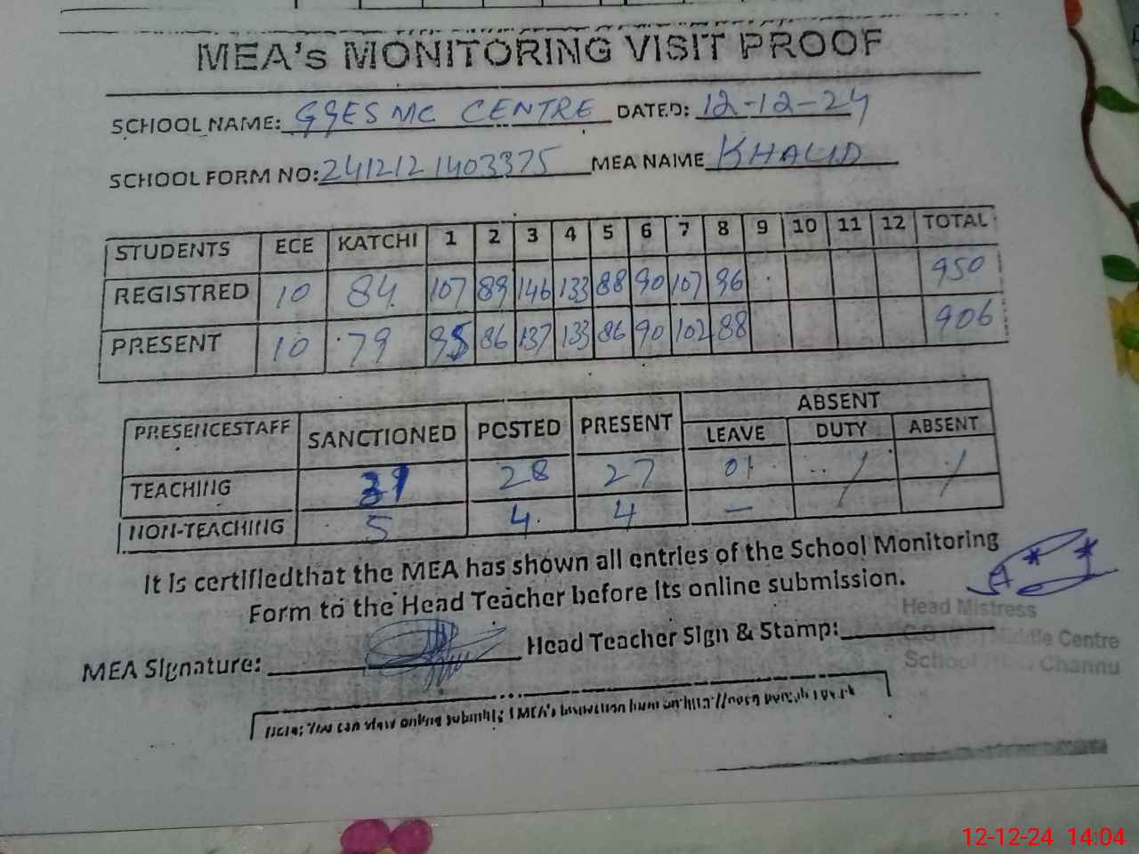 | Attendance Register | Head Teacher | MEA with School | Visit Proof |