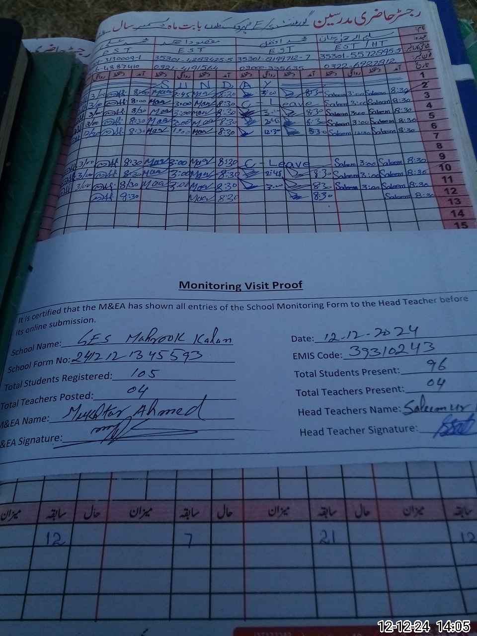 | Attendance Register | Head Teacher | MEA with School | Visit Proof |