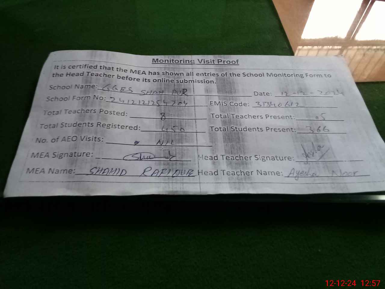 | Attendance Register | Head Teacher | MEA with School | Visit Proof |