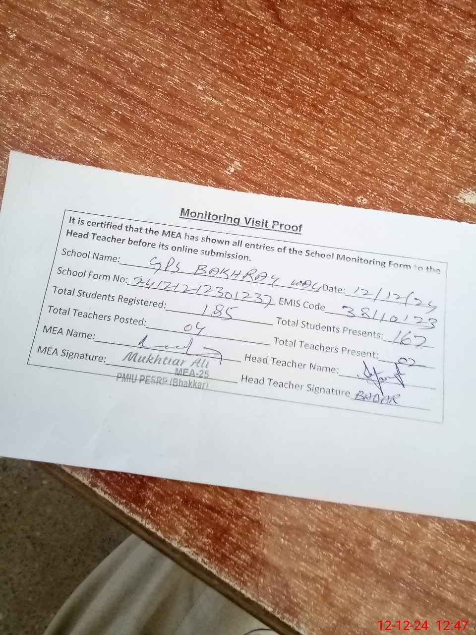 | Attendance Register | Head Teacher | MEA with School | Visit Proof |