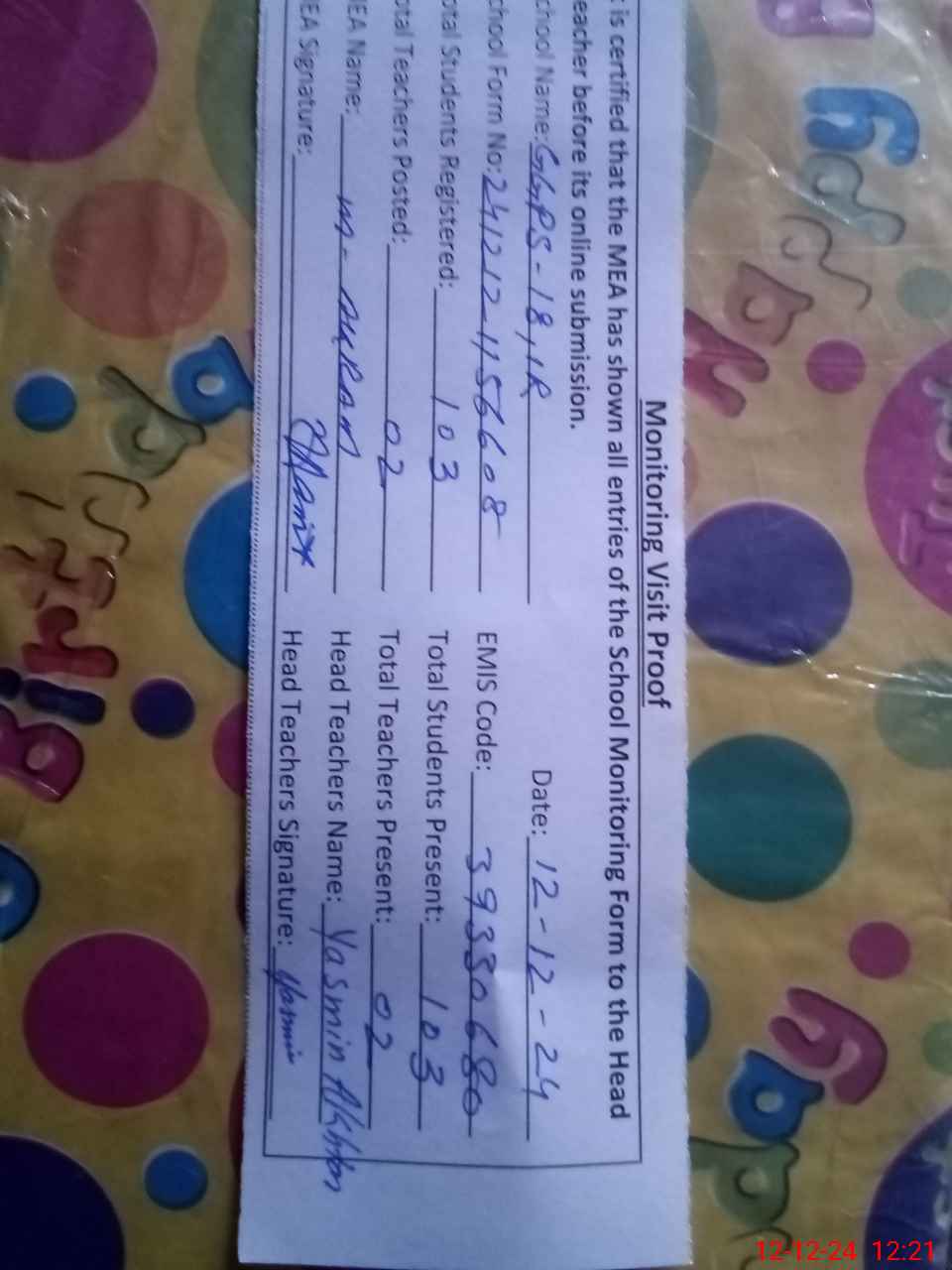 | Attendance Register | Head Teacher | MEA with School | Visit Proof |