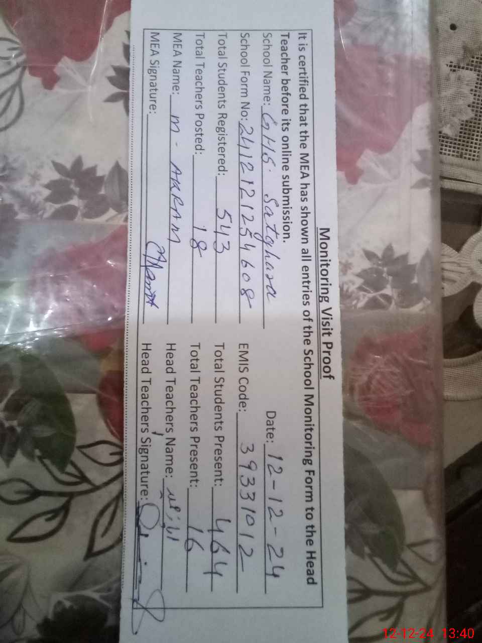 | Attendance Register | Head Teacher | MEA with School | Visit Proof |