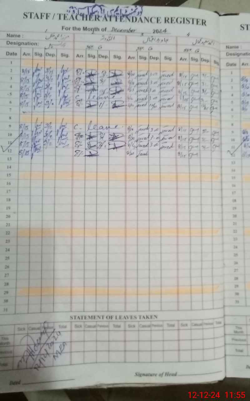 | CNIC | Full Name | Designation | R/C | Absence During Last Calender Month |