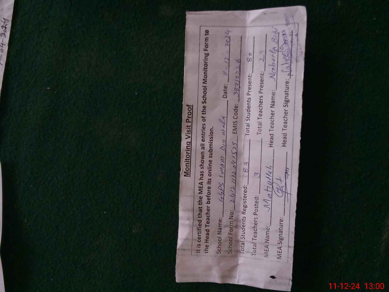| Attendance Register | Head Teacher | MEA with School | Visit Proof |