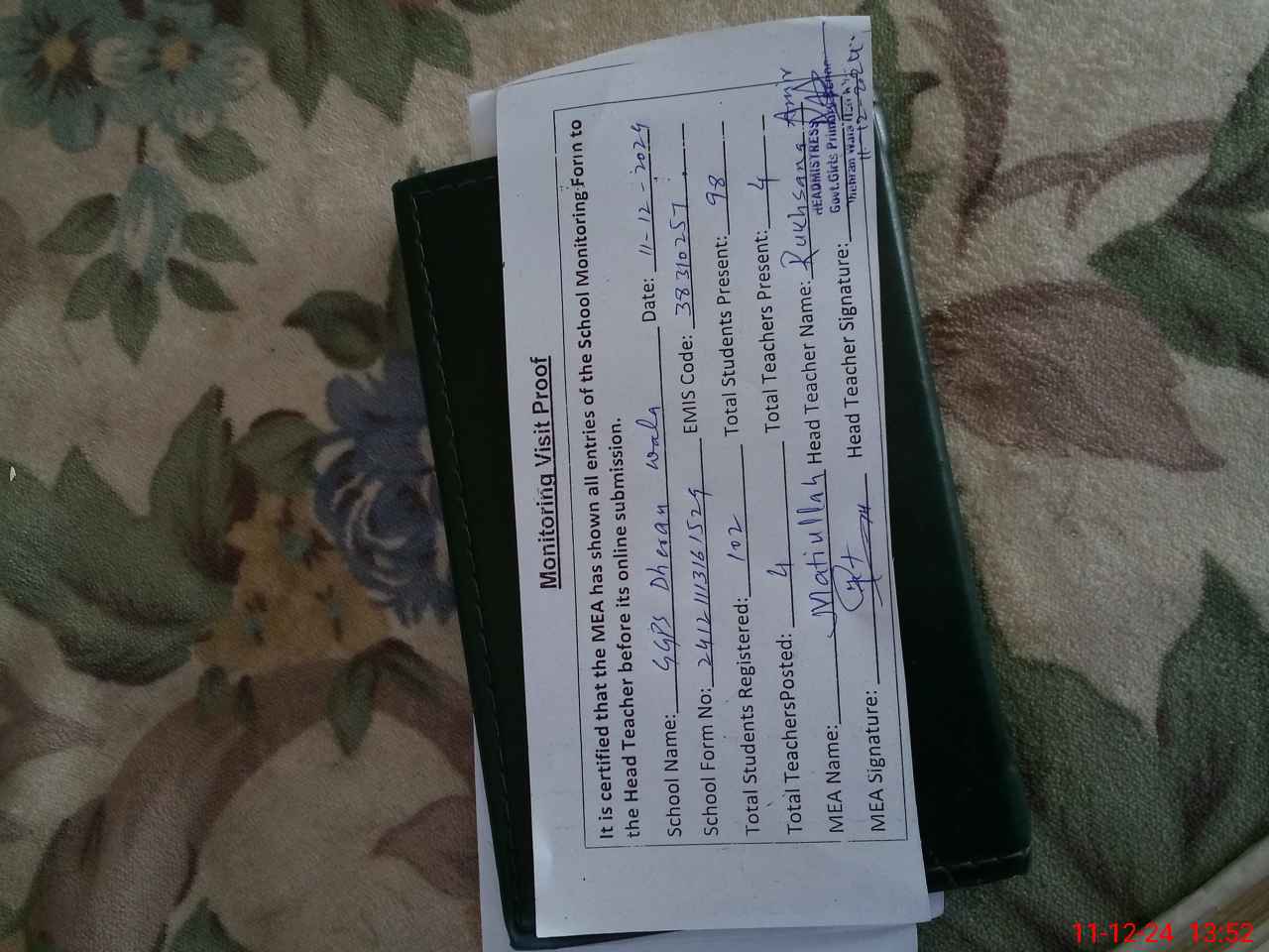 | Attendance Register | Head Teacher | MEA with School | Visit Proof |