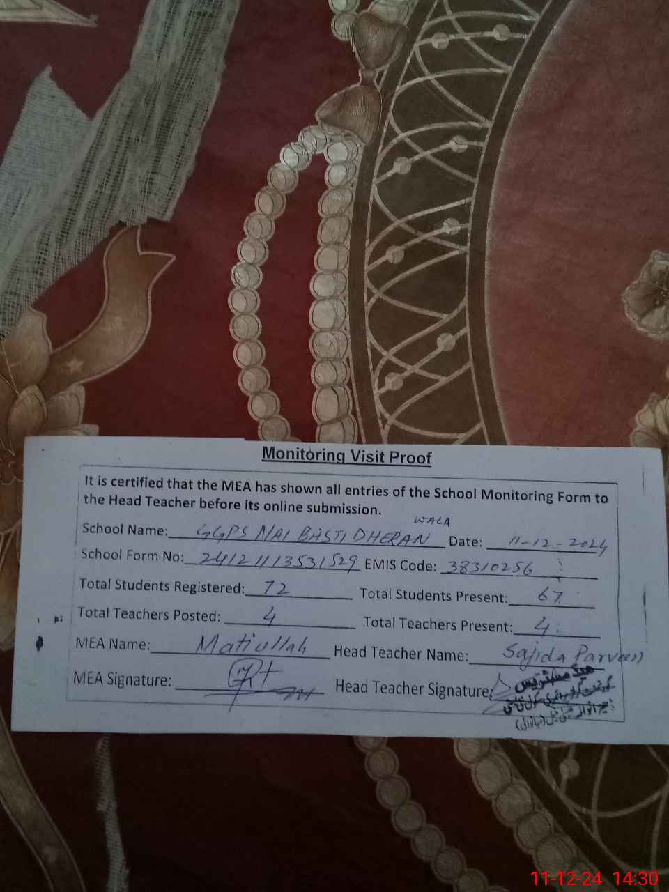 | Attendance Register | Head Teacher | MEA with School | Visit Proof |