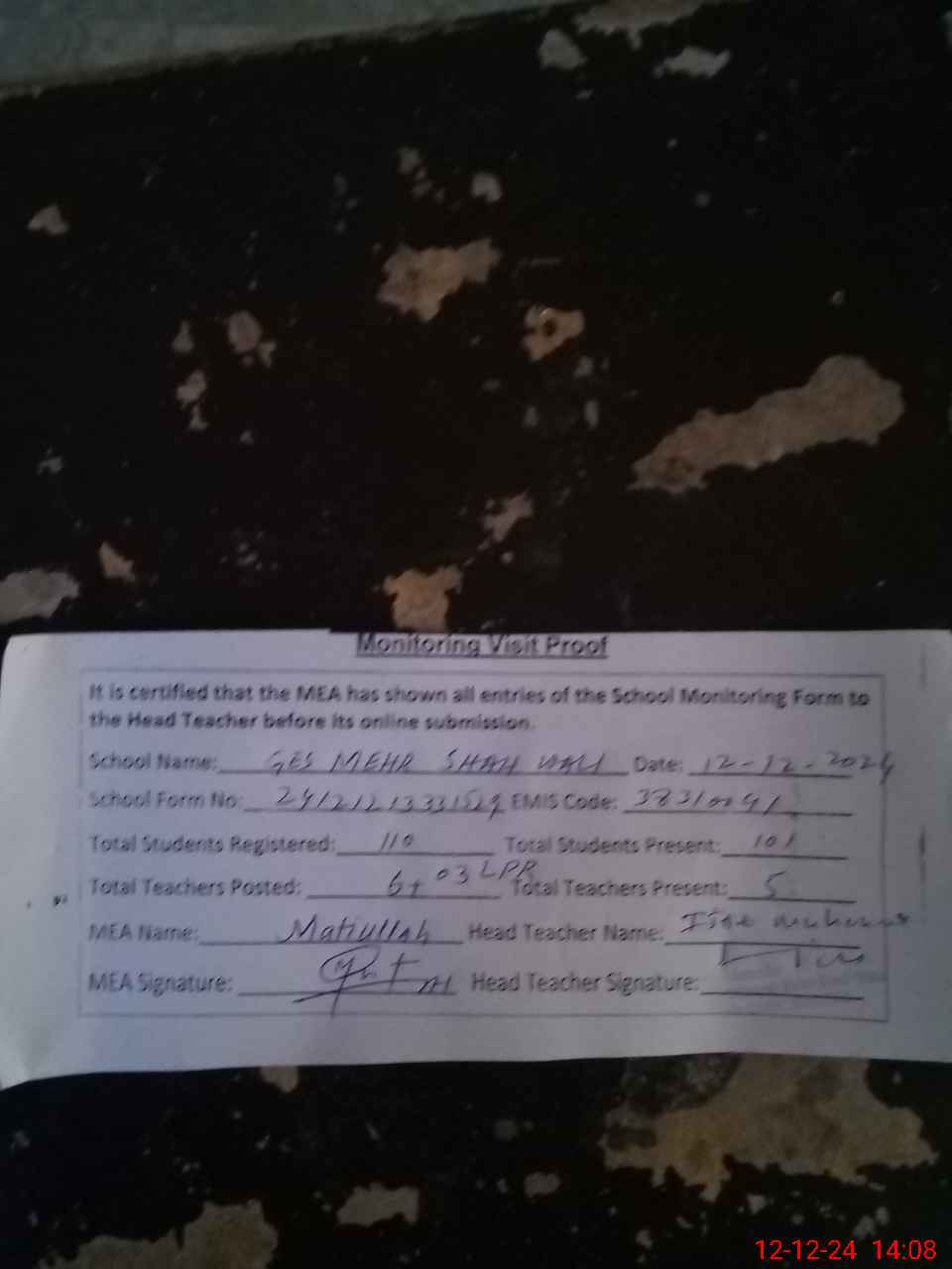 | Attendance Register | Head Teacher | MEA with School | Visit Proof |