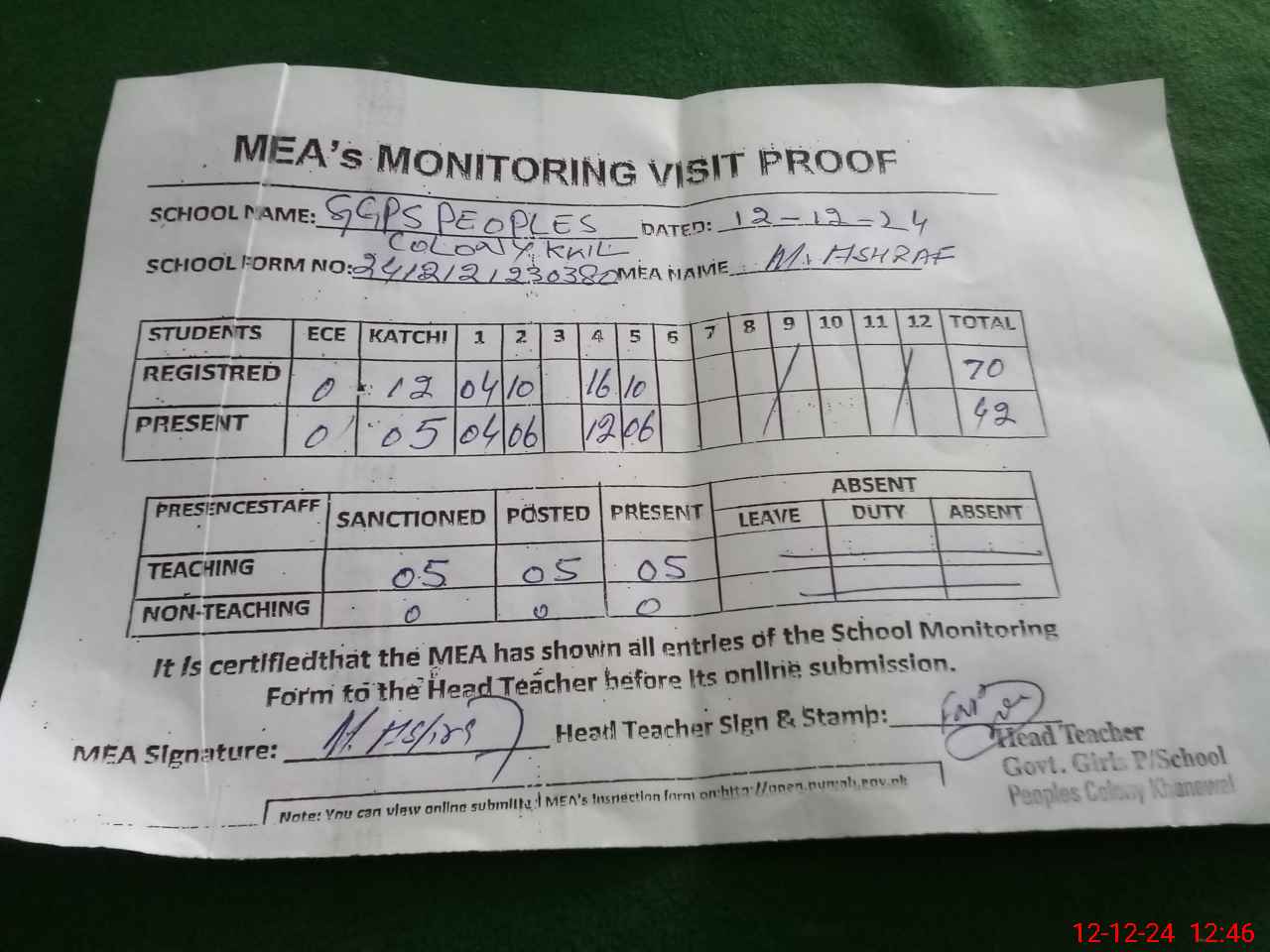 | EMIS Code: 36420350 | Name of School: GGPS PEOPLES COLONY, KHANEWAL | |||