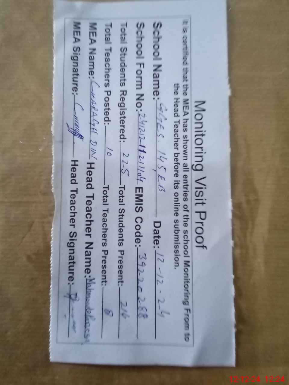 | Attendance Register | Head Teacher | MEA with School | Visit Proof |