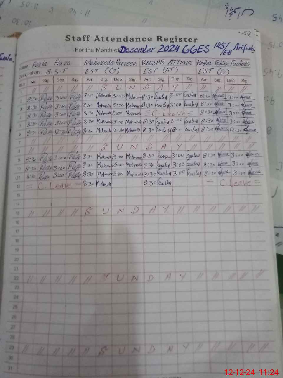 | CNIC | Full Name | Designation | R/C | Absence During Last Calender Month |