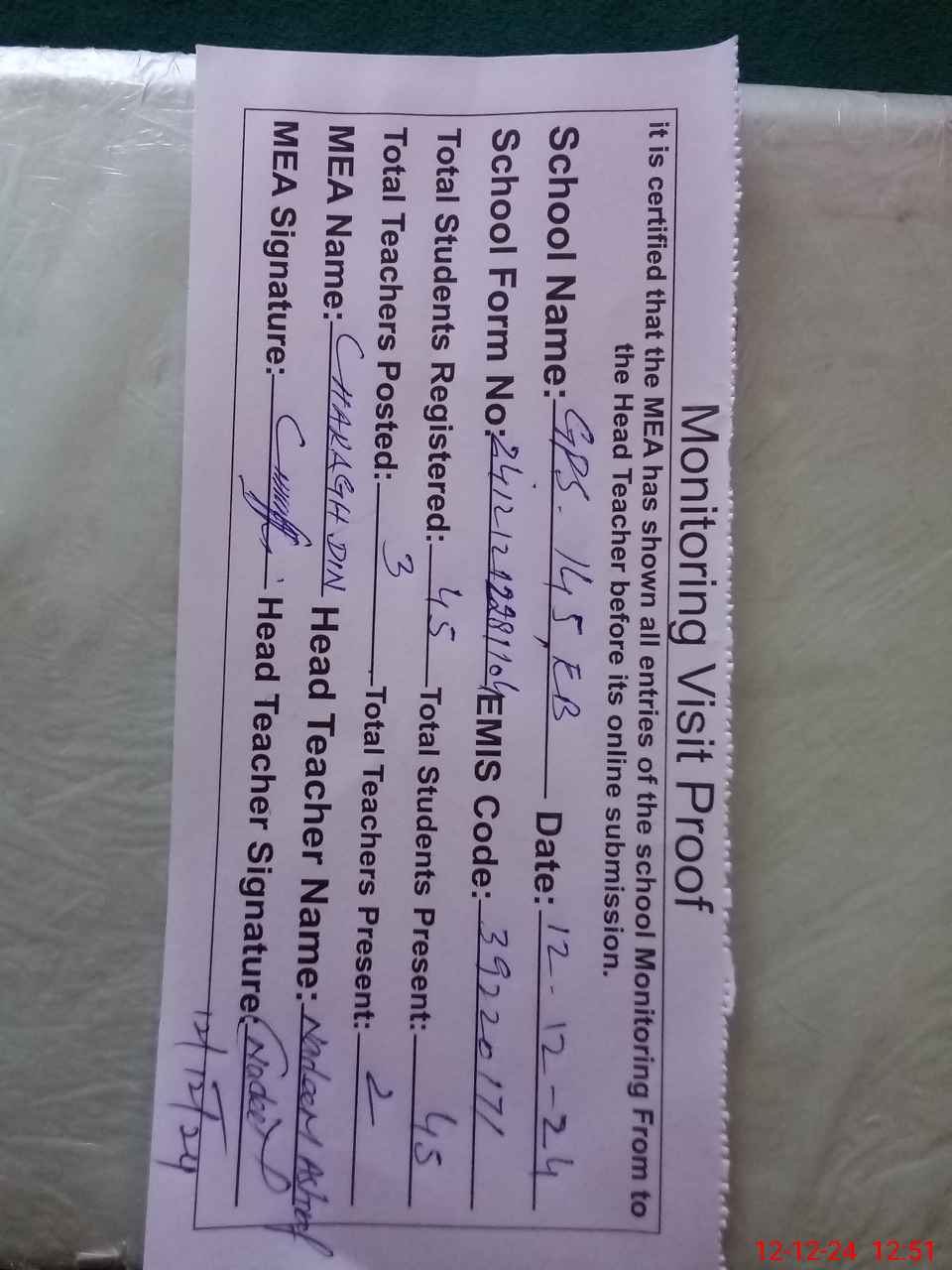 | Attendance Register | Head Teacher | MEA with School | Visit Proof |