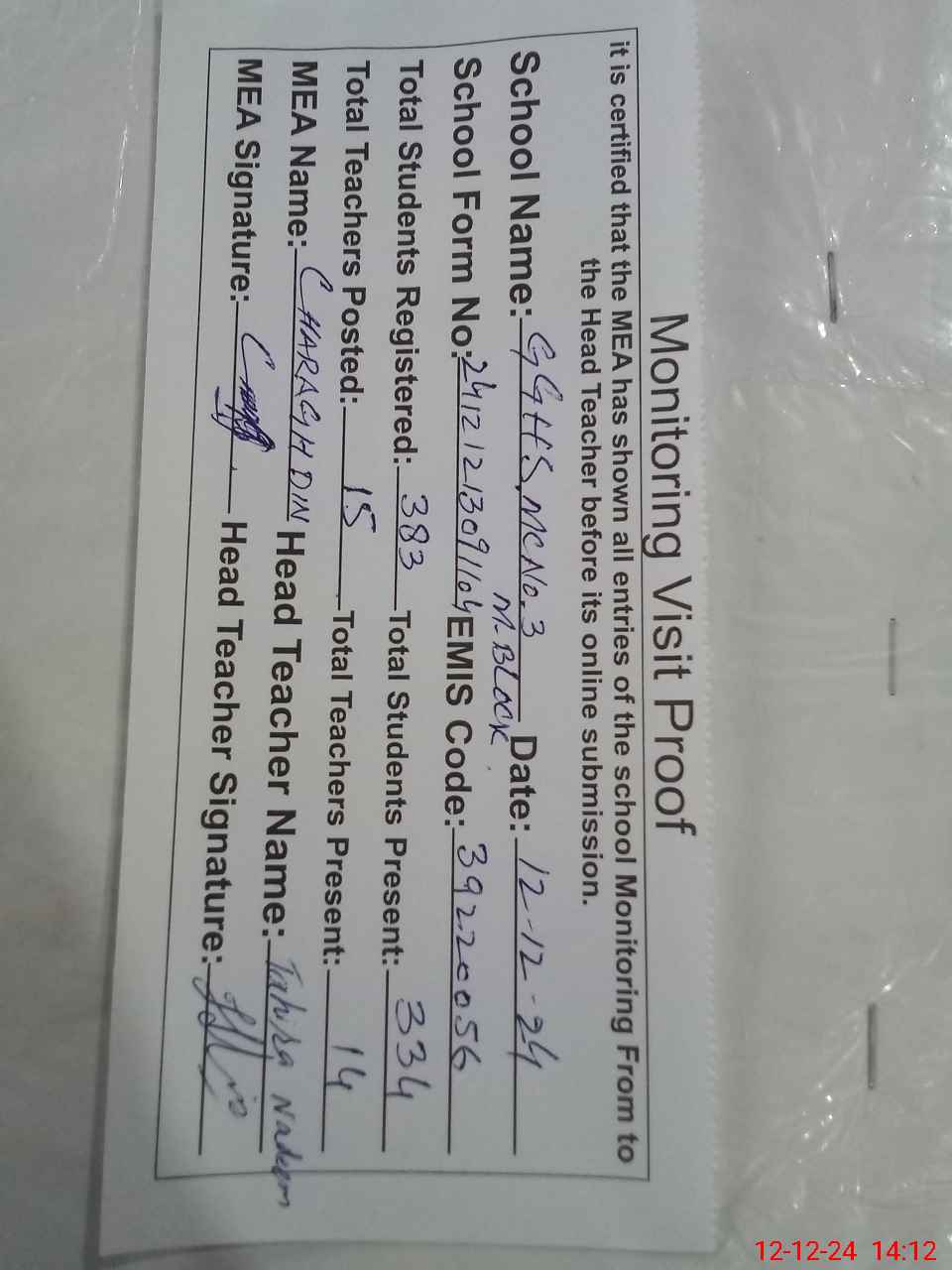 | EMIS Code: 39220056 | Name of School: GGHS MC NO.3 M BLOCK ARIFWALA | |||