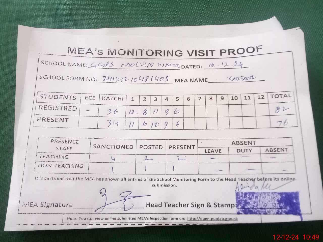 | Attendance Register | Head Teacher | MEA with School | Visit Proof |