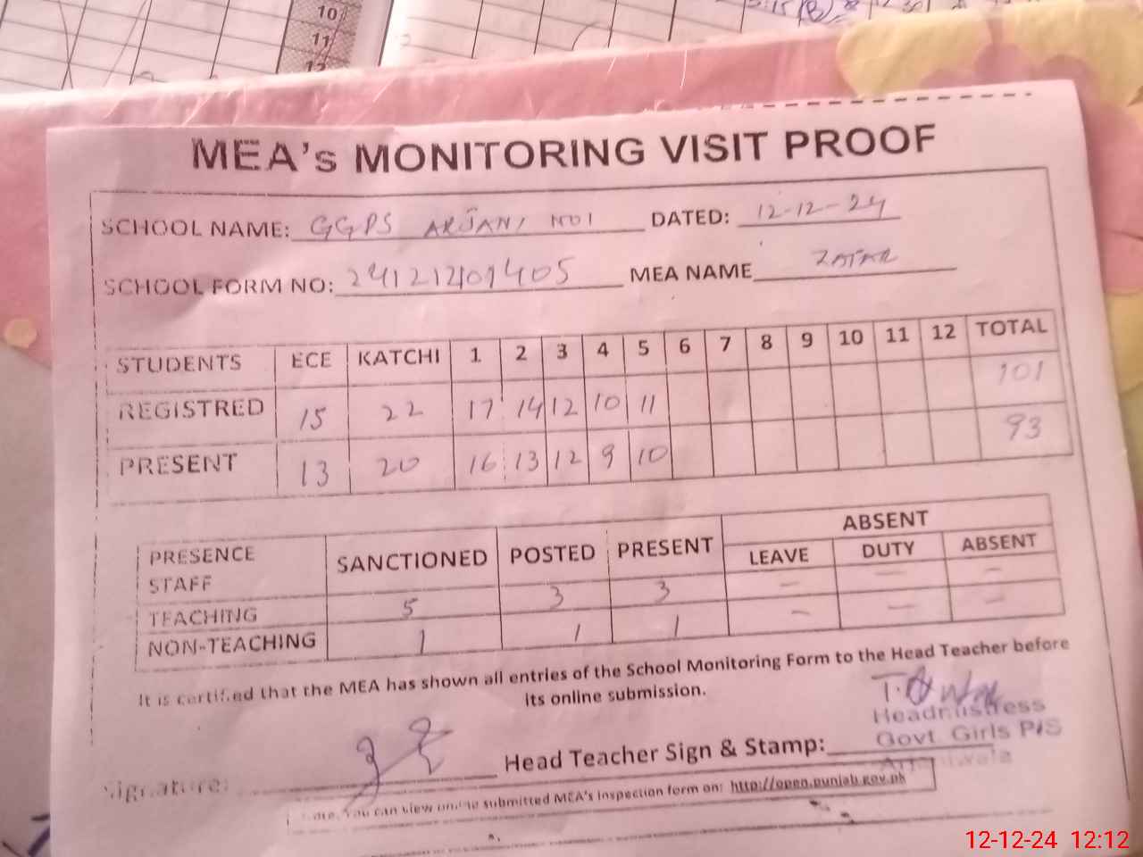 | Attendance Register | Head Teacher | MEA with School | Visit Proof |
