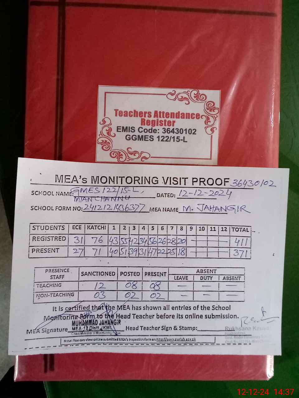 | EMIS Code: 36430102 | Name of School: GMES 122/15-L, MIAN CHANNU | |||