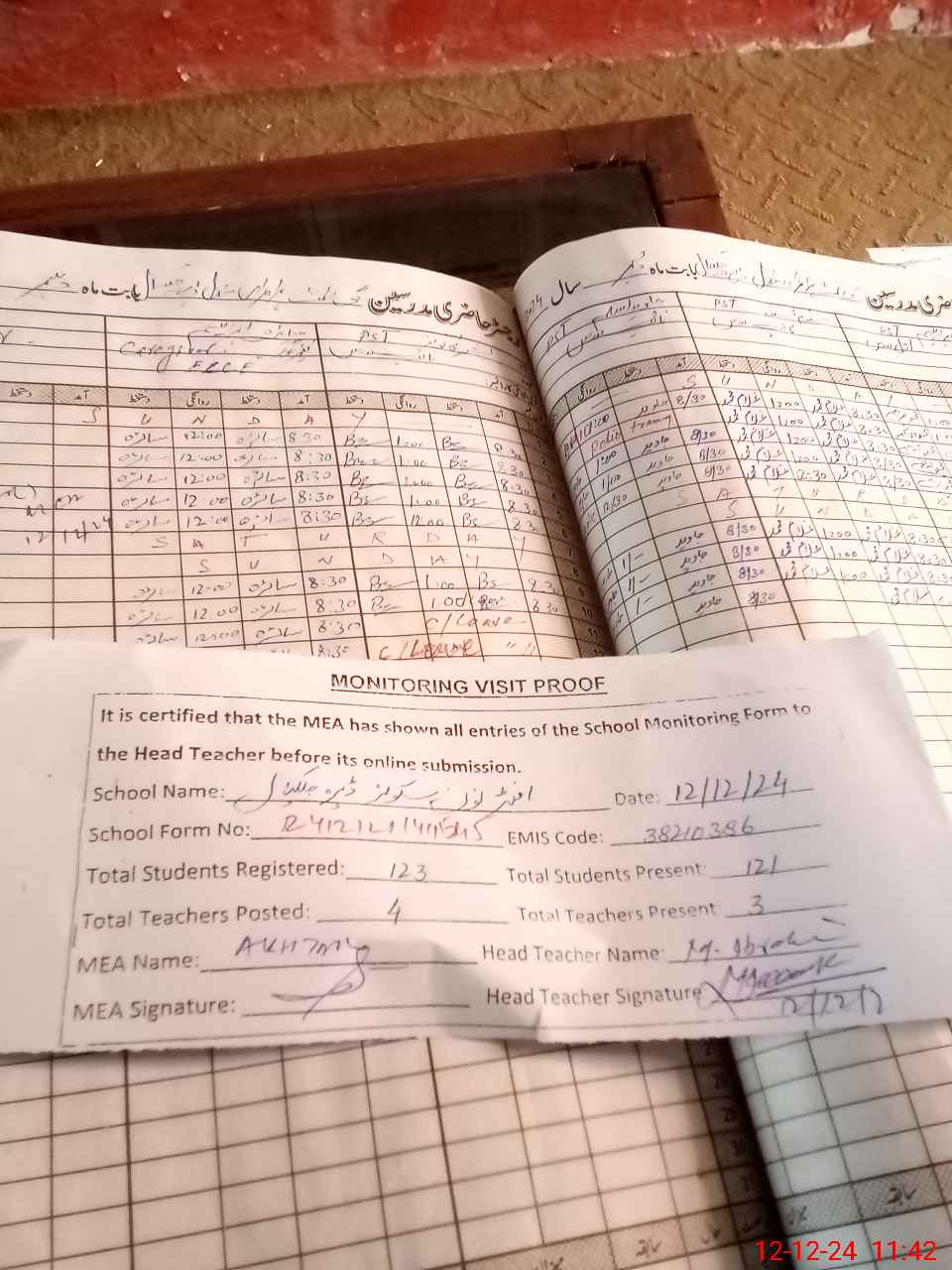 | Attendance Register | Head Teacher | MEA with School | Visit Proof |