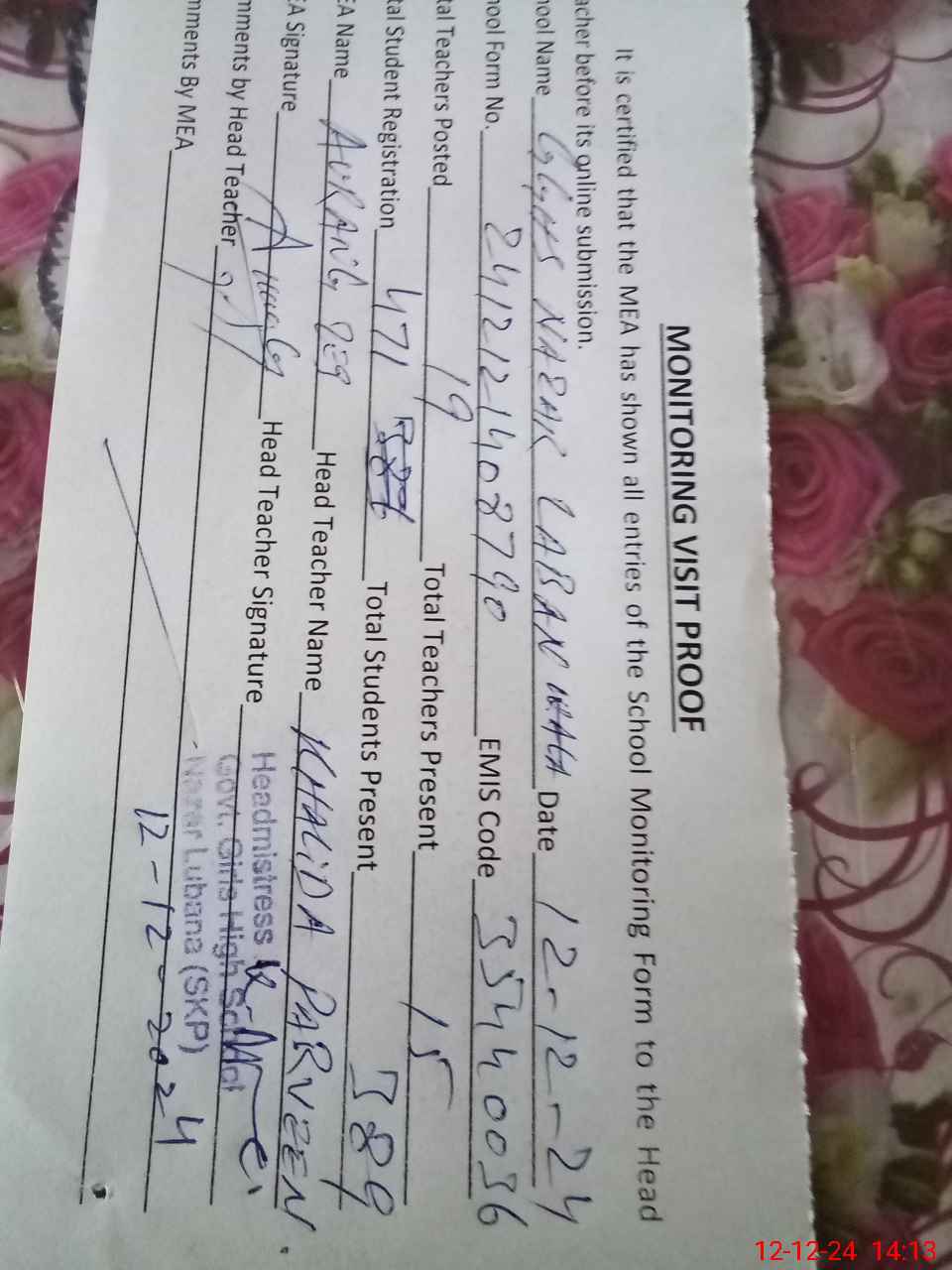 | Attendance Register | Head Teacher | MEA with School | Visit Proof |