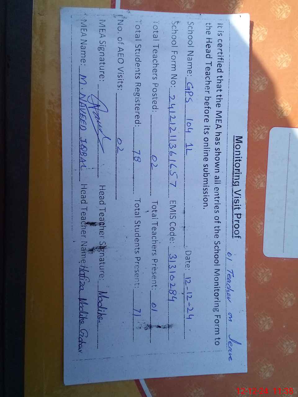 | EMIS Code: 31310284 | Name of School: GPS CHAK NO.104/1-L | |||