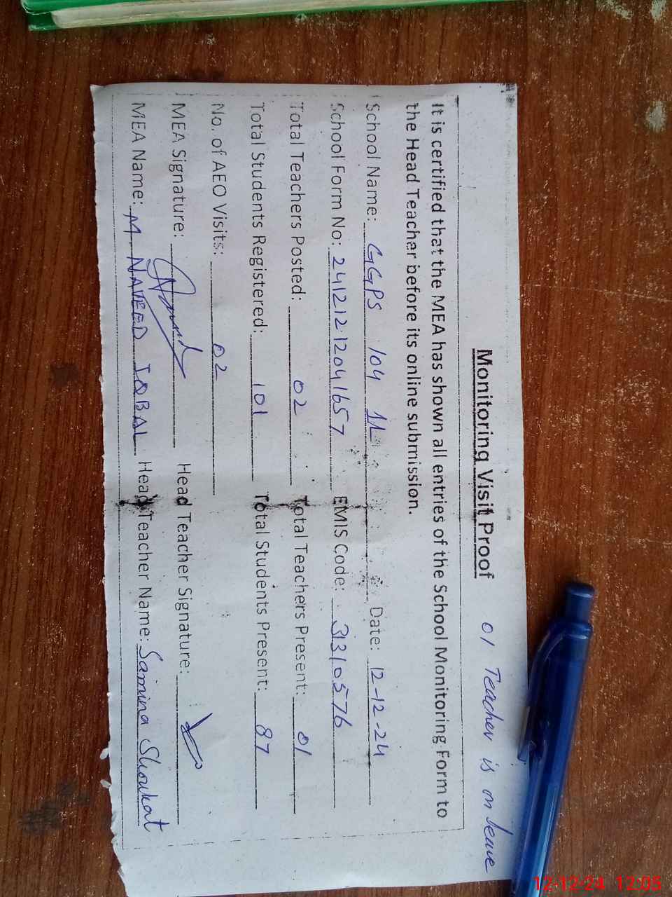 | Attendance Register | Head Teacher | MEA with School | Visit Proof |