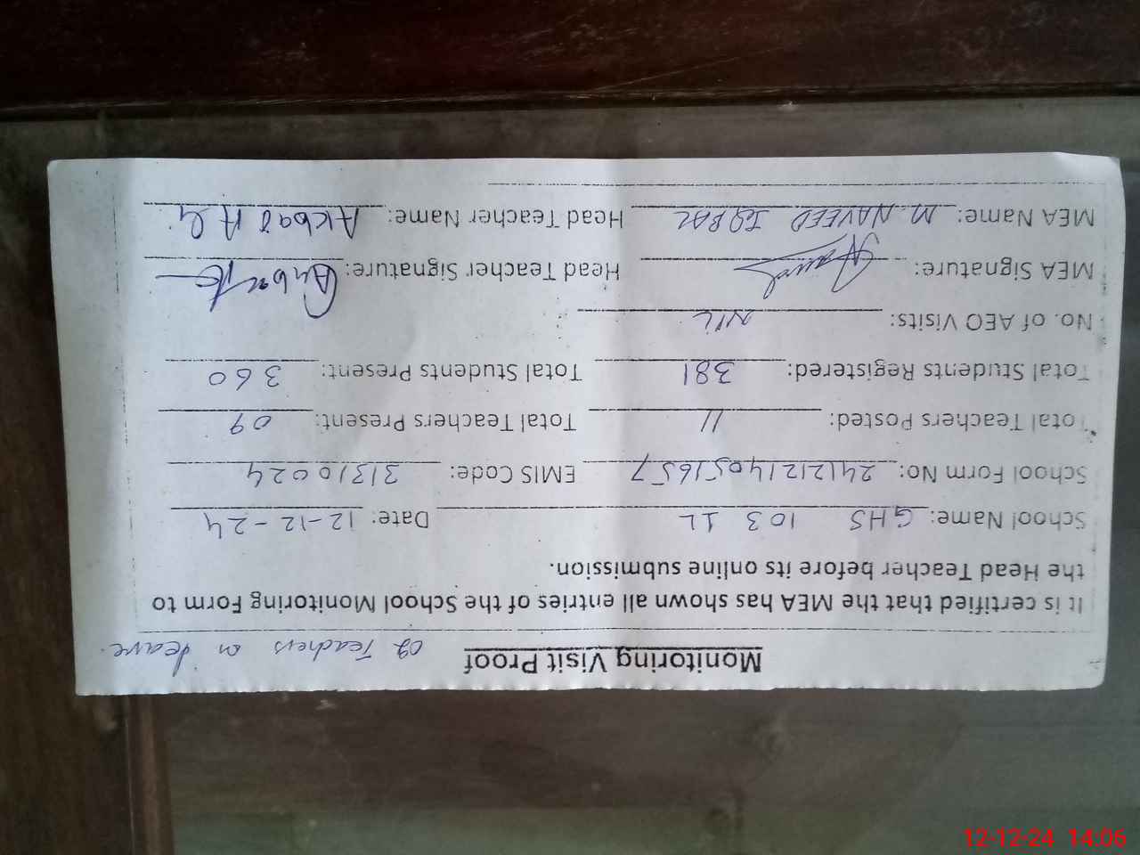 | Attendance Register | Head Teacher | MEA with School | Visit Proof |