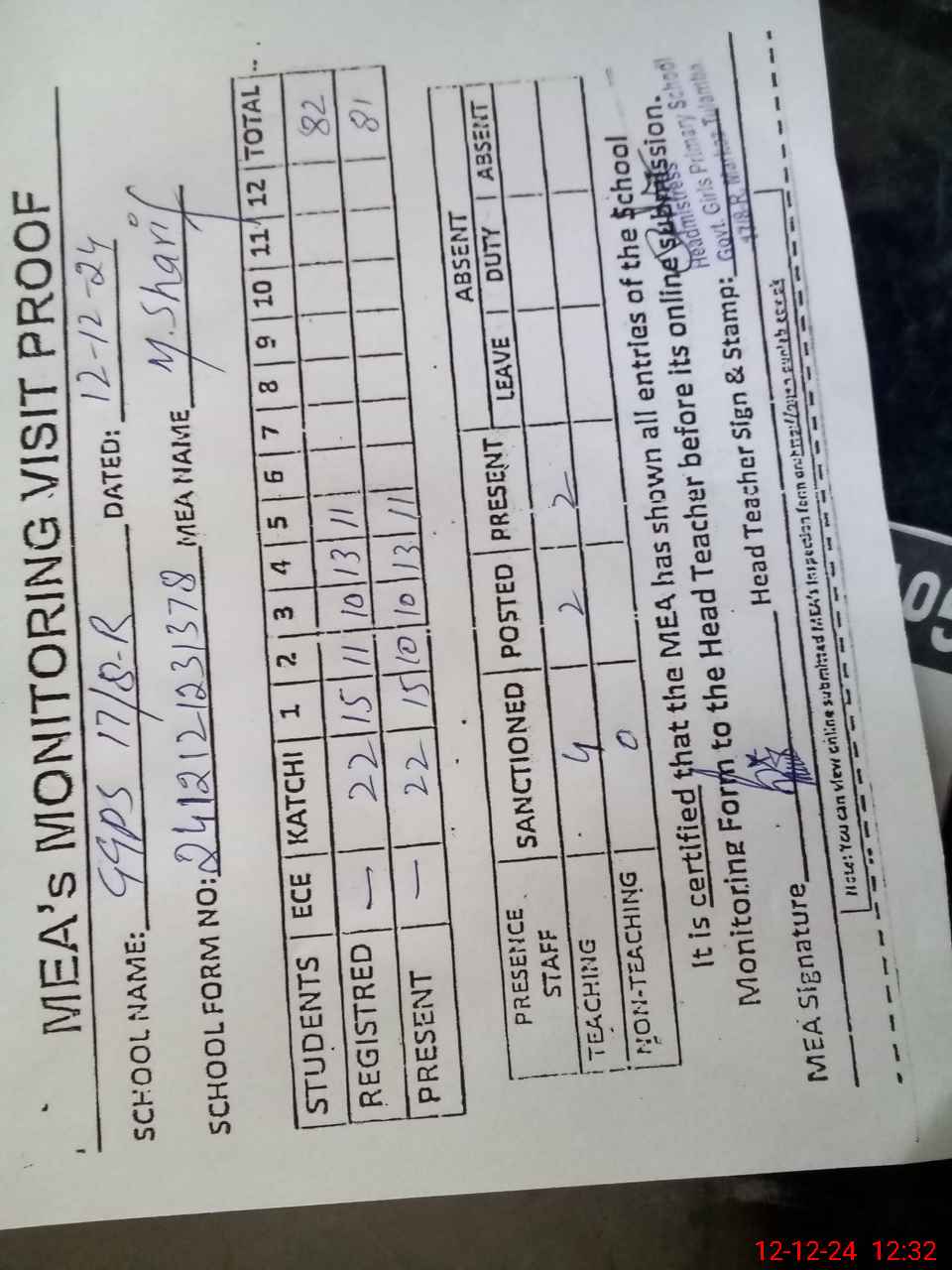 | Attendance Register | Head Teacher | MEA with School | Visit Proof |