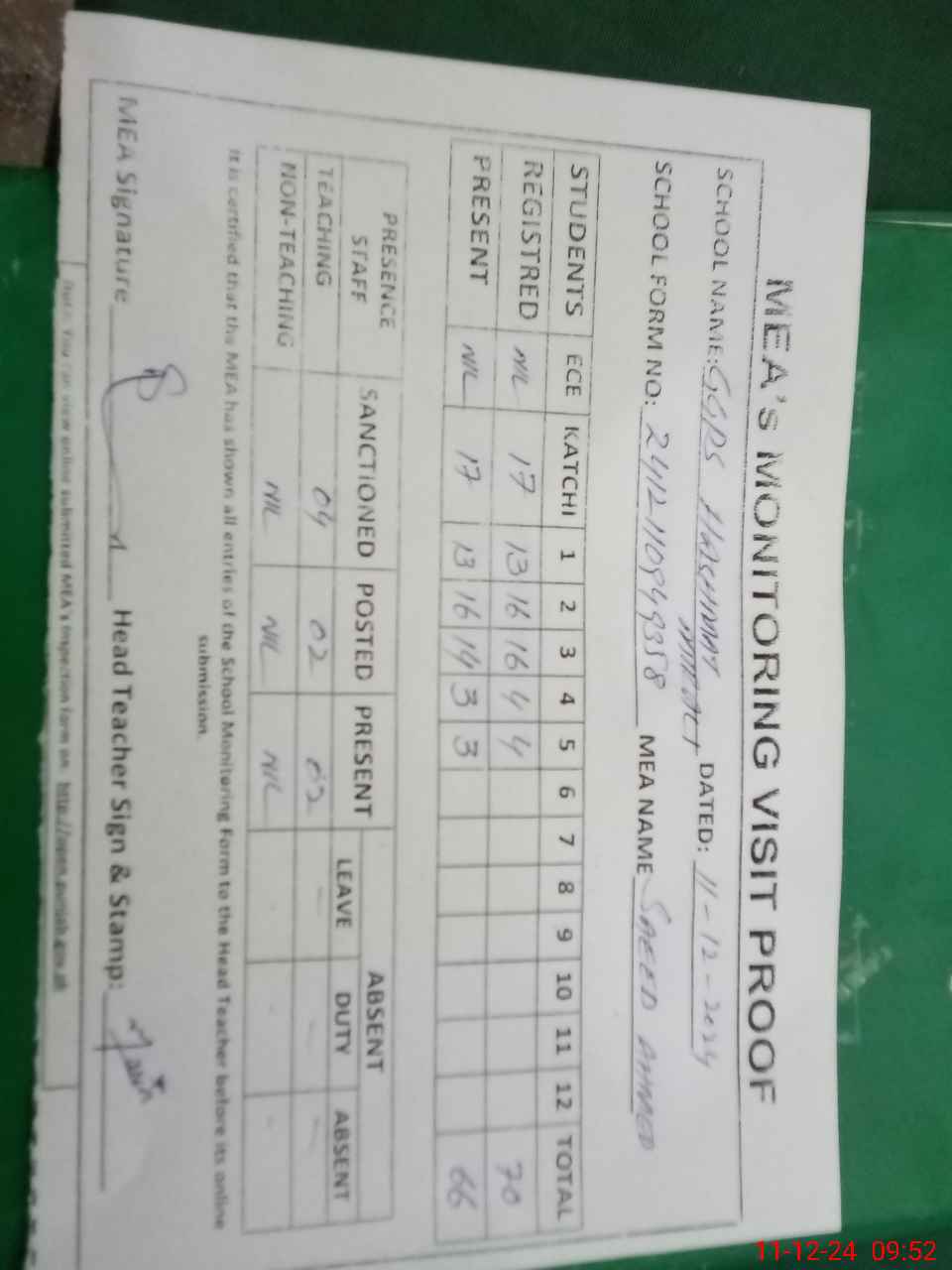 | Attendance Register | Head Teacher | MEA with School | Visit Proof |