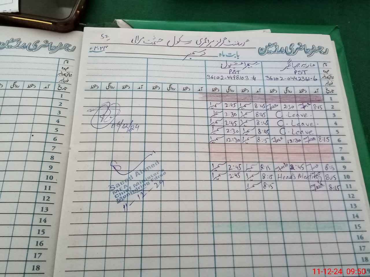 | CNIC | Full Name | Designation | R/C | Absence During Last Calender Month |