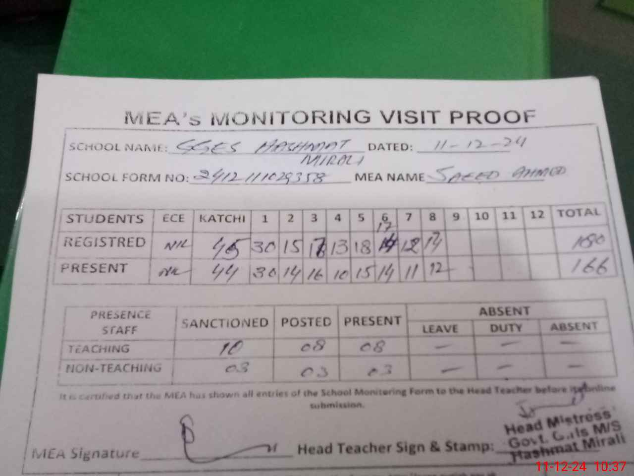| Attendance Register | Head Teacher | MEA with School | Visit Proof |