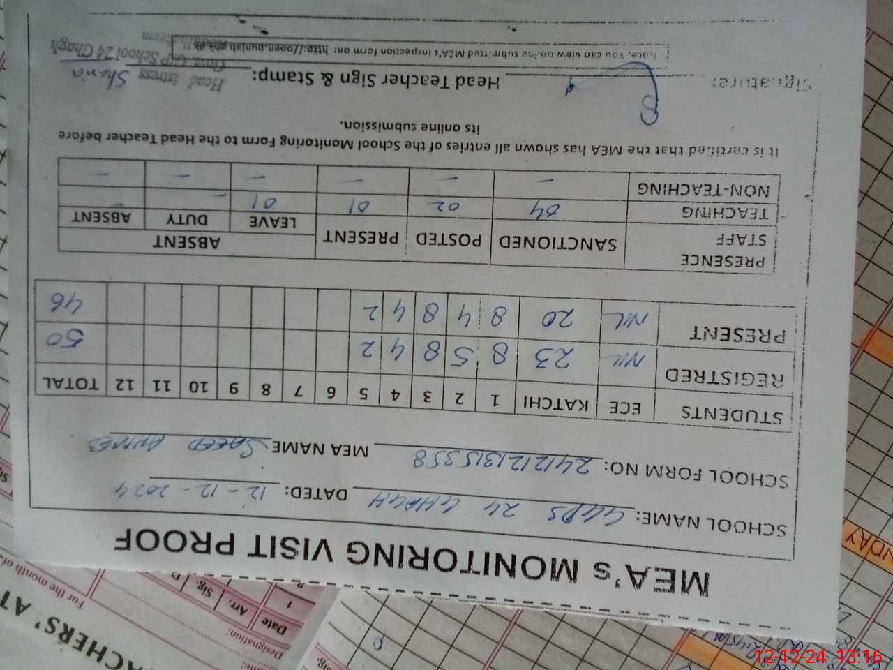 | Attendance Register | Head Teacher | MEA with School | Visit Proof |