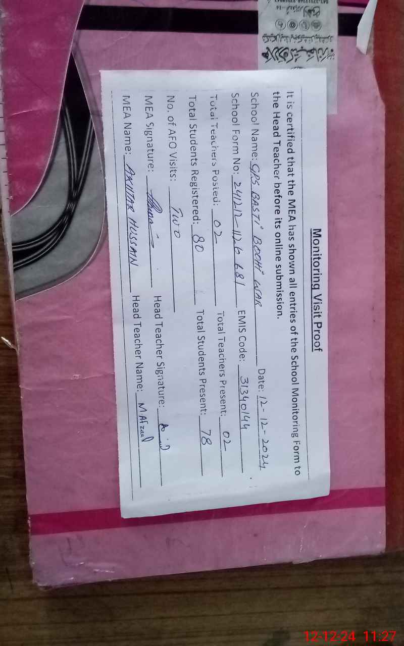 | EMIS Code: 31340144 | Name of School: GPS BASTI BOOHI WAR | |||