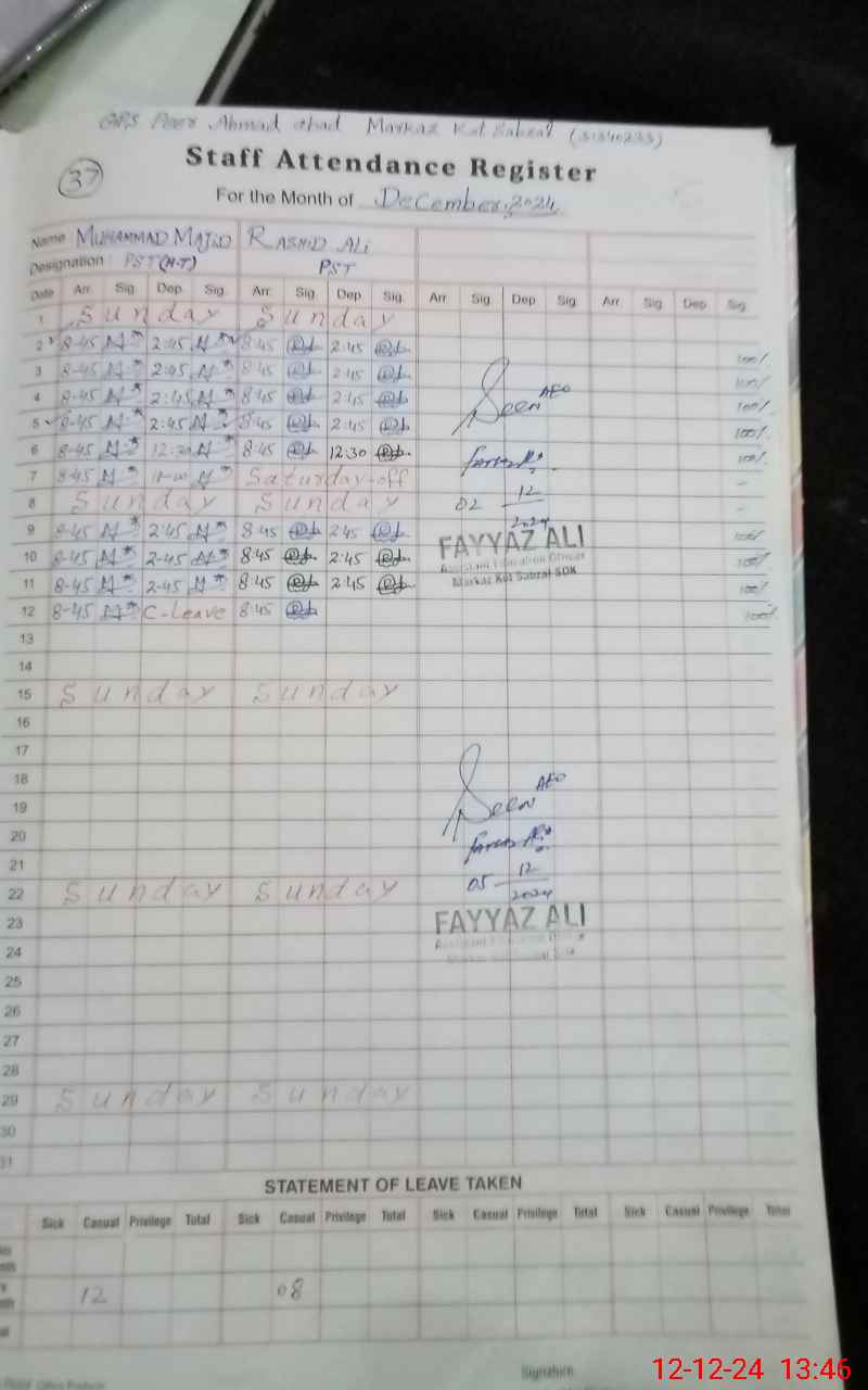 | CNIC | Full Name | Designation | R/C | Absence During Last Calender Month |