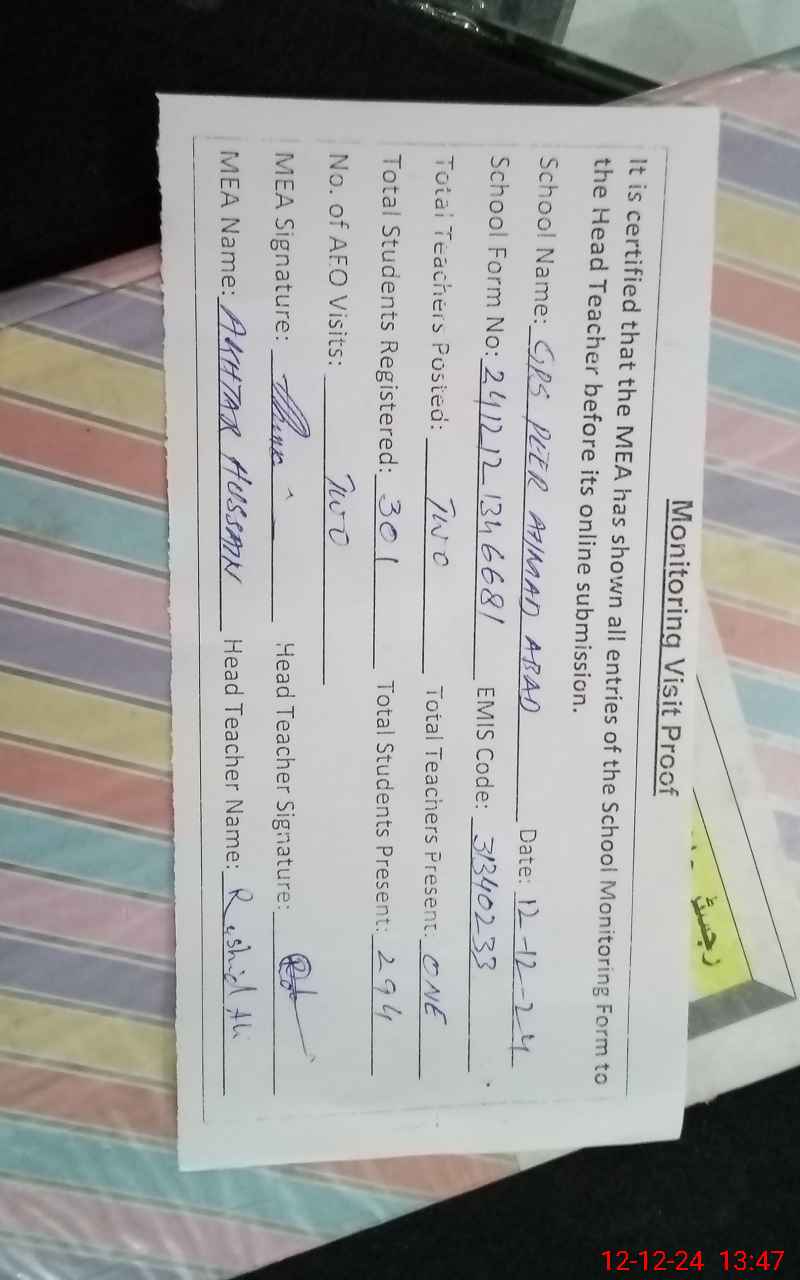 | EMIS Code: 31340233 | Name of School: GPS PEER AHMAD ABAD | |||