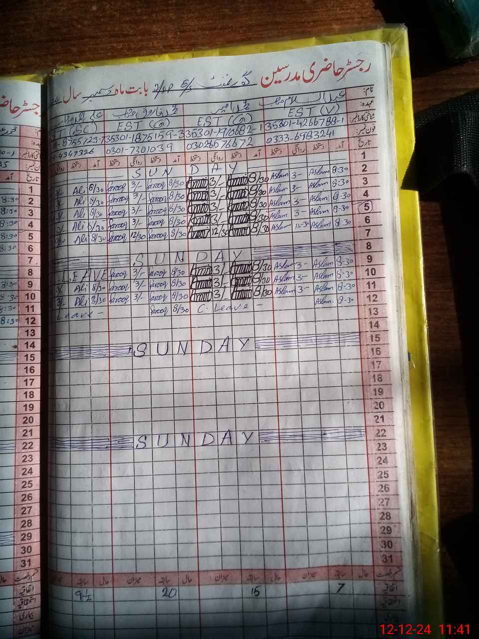 | CNIC | Full Name | Designation | R/C | Absence During Last Calender Month |