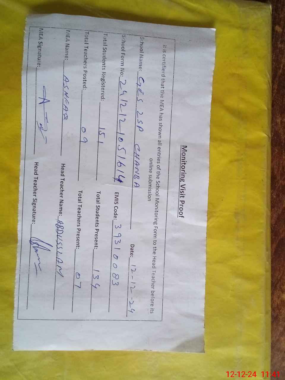 | Attendance Register | Head Teacher | MEA with School | Visit Proof |