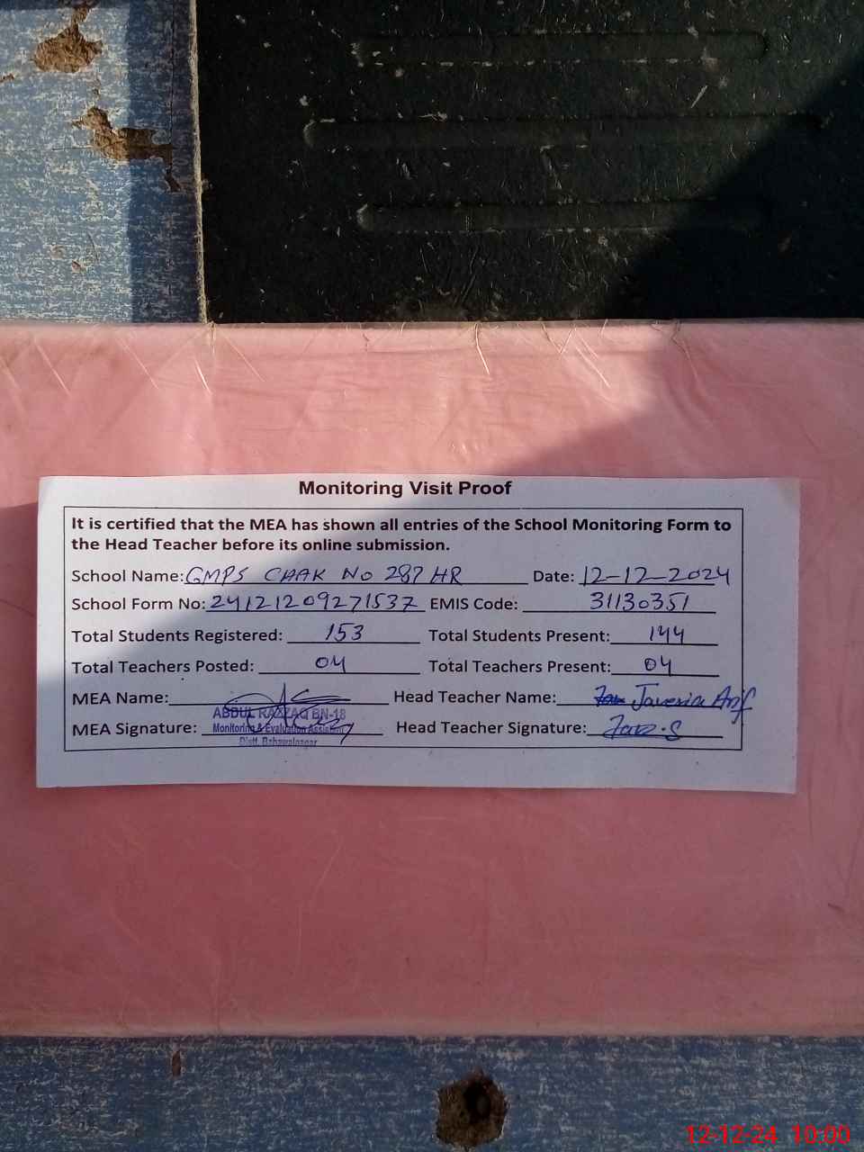 | Attendance Register | Head Teacher | MEA with School | Visit Proof |