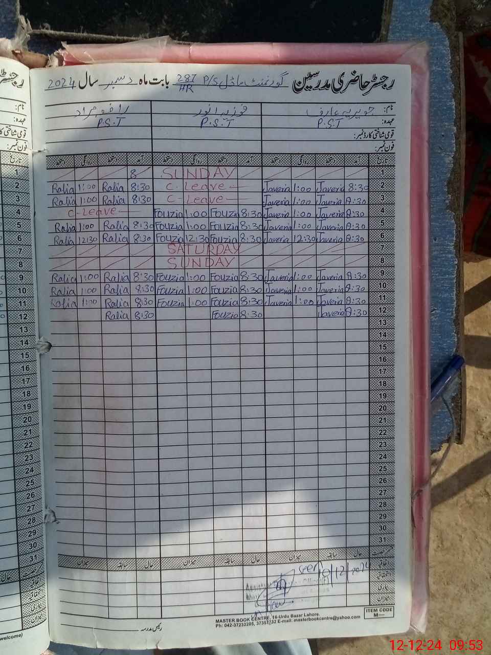 | CNIC | Full Name | Designation | R/C | Absence During Last Calender Month |