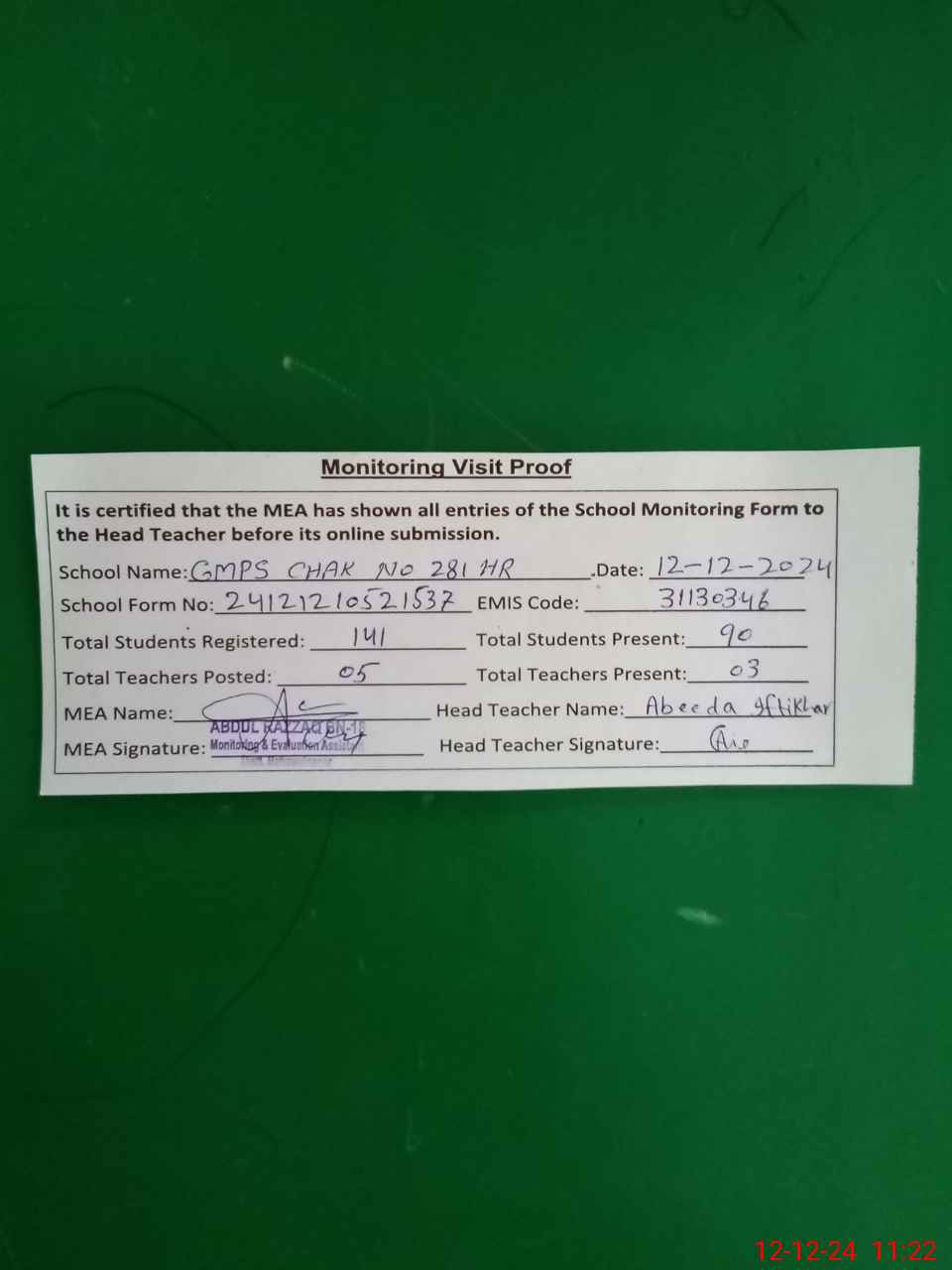| EMIS Code: 31130346 | Name of School: GMPS CHAK NO 281 HR | |||
