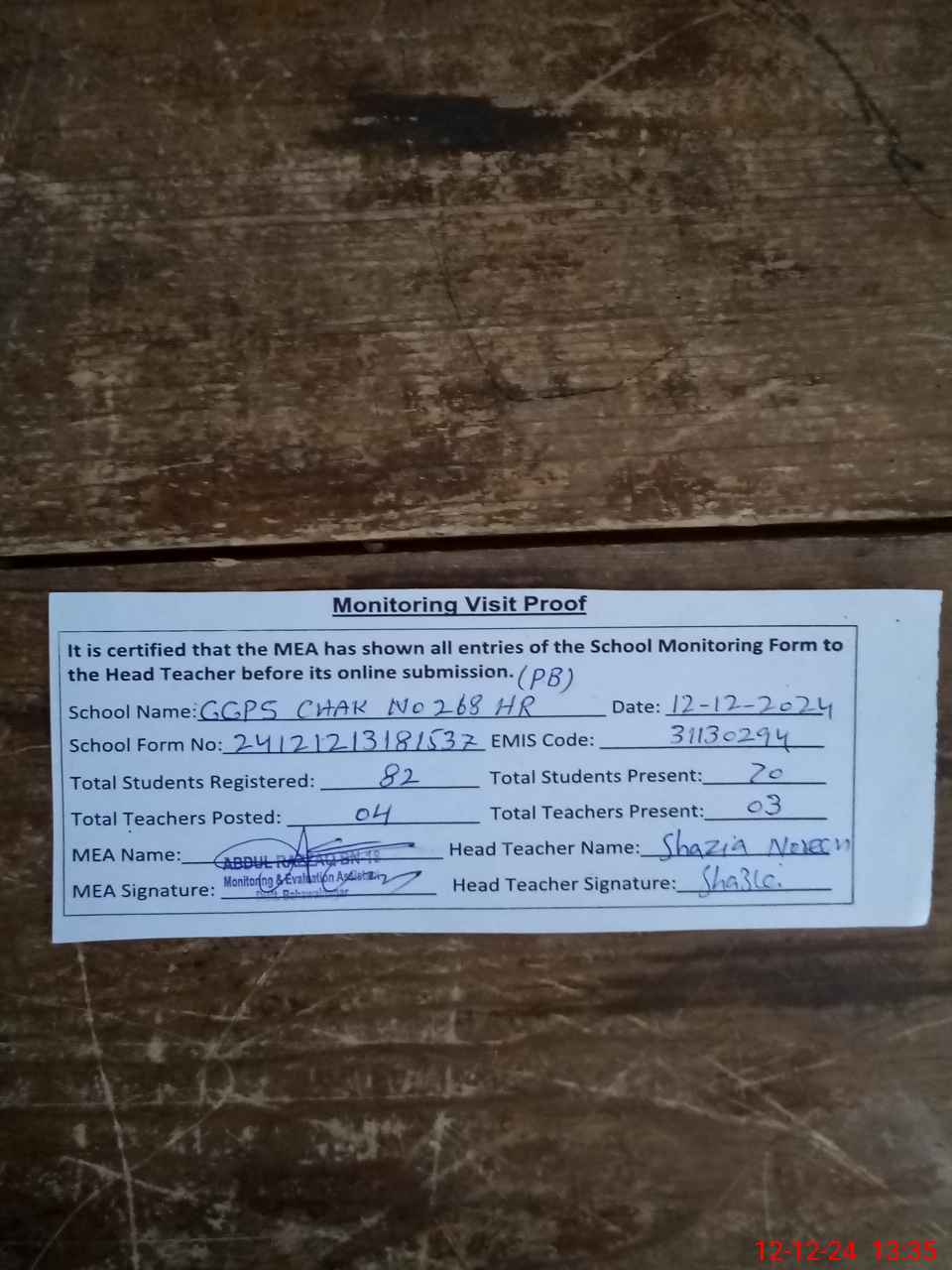 | Attendance Register | Head Teacher | MEA with School | Visit Proof |