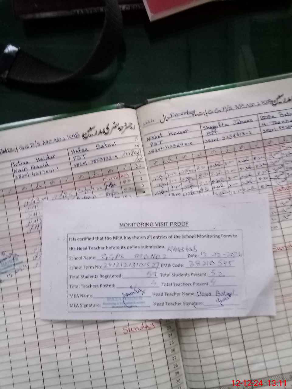 | Attendance Register | Head Teacher | MEA with School | Visit Proof |