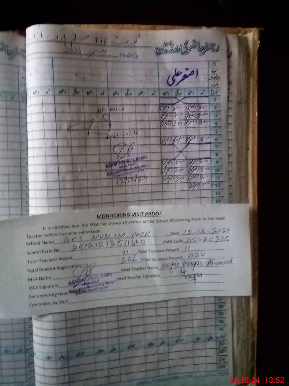 | Attendance Register | Head Teacher | MEA with School | Visit Proof |