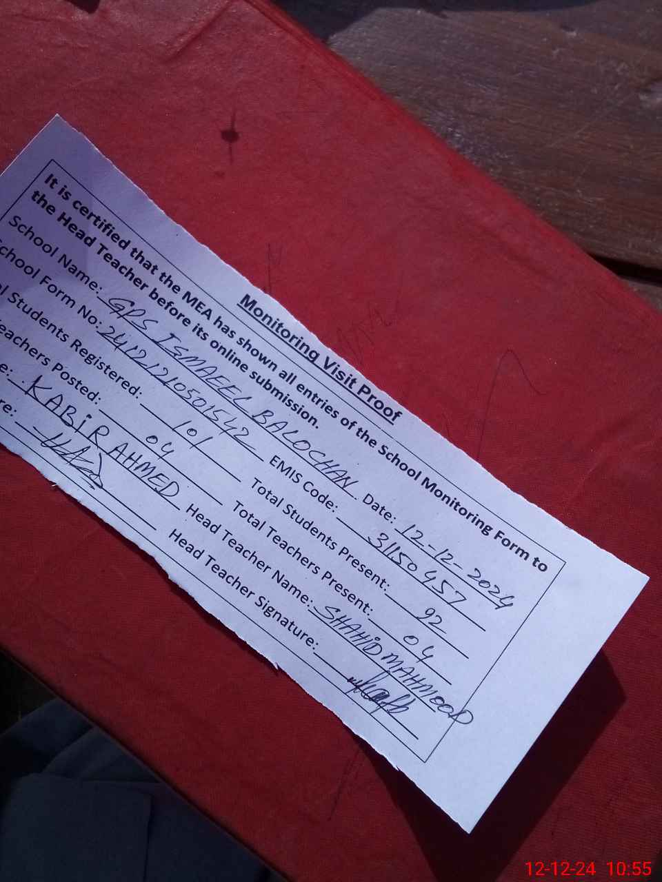 | EMIS Code: 31150457 | Name of School: GPS ISMAEEL BALOCHAN | |||