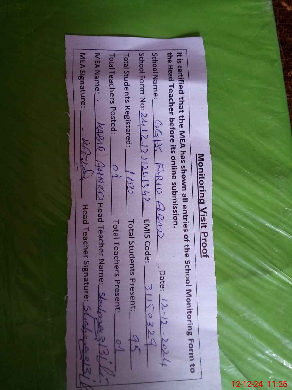 | EMIS Code: 31150329 | Name of School: GGPS FARID ABAD | |||