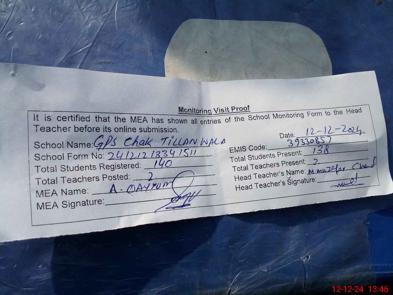 | Attendance Register | Head Teacher | MEA with School | Visit Proof |