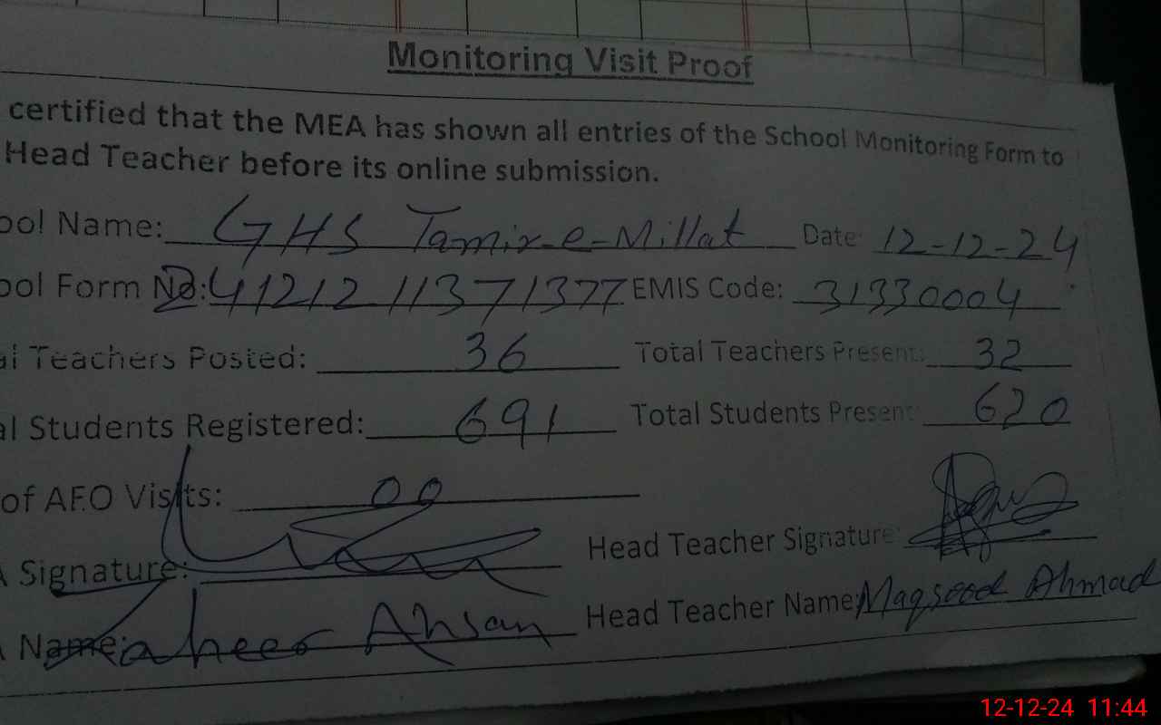 | Monitoring Date: 12-12-2024 | Start Time: 12-12-2024 09:32 AM | End Time: 12-12-2024 11:56 AM | Name of MEA: Za**** Ah**** | |